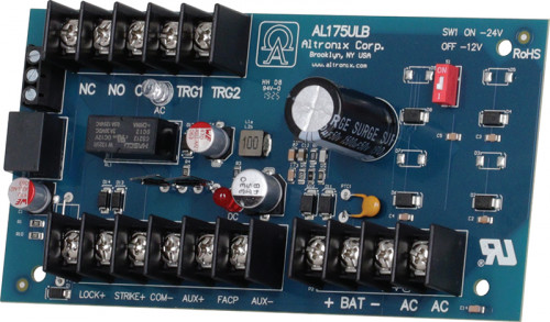 AL175ULB is a power-limited power supply/charger that converts a 24VAC input into two (2) individual PTC protected 12VDC or 24VDC outputs (see specifications). It is intended for use in applications requiring UL Listing for Access Control (UL294) and applications requiring an interface with Fire Alarm Control Panels.