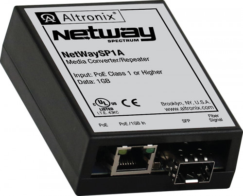 Altronix NetWaySP1A PoE powered media converter/repeater converts a Gigabit (1000Mbps) Ethernet to Fiber (1000Base-X/SX/LX).
