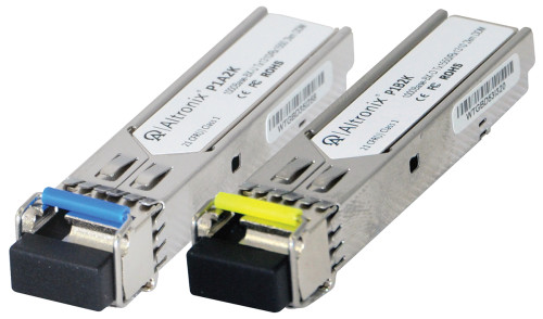 Altronix P1AB2K kit includes 1 P1A2K and 1 P1B2K hot-pluggable Bi-Directional single strand SFP fiber transceiver modules and is readily usable with all Altronix NetWay Spectrum fiber optic equipment for 1G transmission rates at distances up to 2km. For use in new or retrofit applications where single strand fiber exists.
